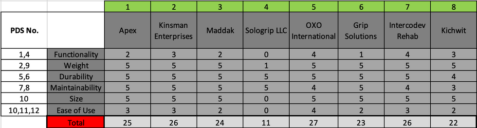 Here you can see the matrix table I have put together for evaluating various design aspects of existing products. PDS numbers on the left refer to the specific requirements laid out in the product design specification.